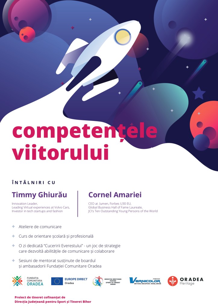 Fundația Comunitară Oradea lansează prin Centrul EUROPE DIRECT Oradea programul ”Competențele viitorului” care cuprinde activități gratuite ce se adresează tinerilor cu vârsta între 16 și 25 de ani și se va desfășura în Oradea în perioada octombrie – noiembrie 2021.