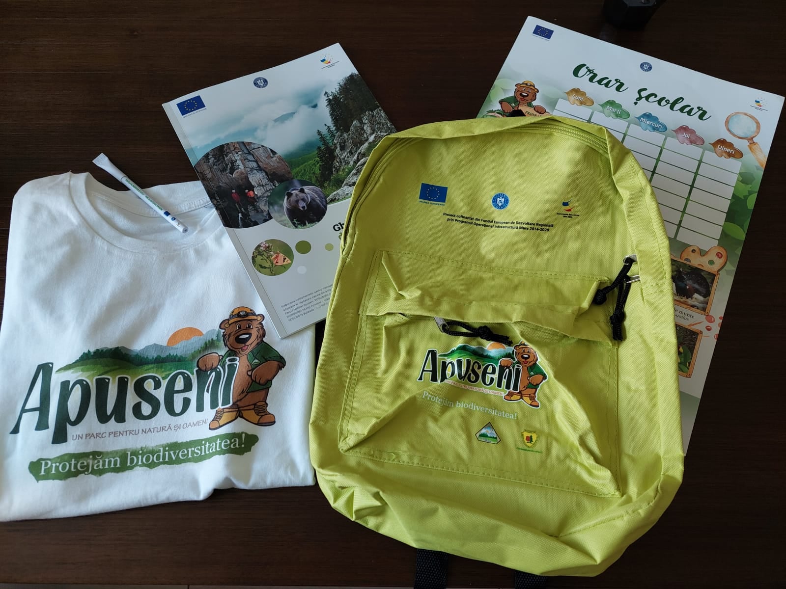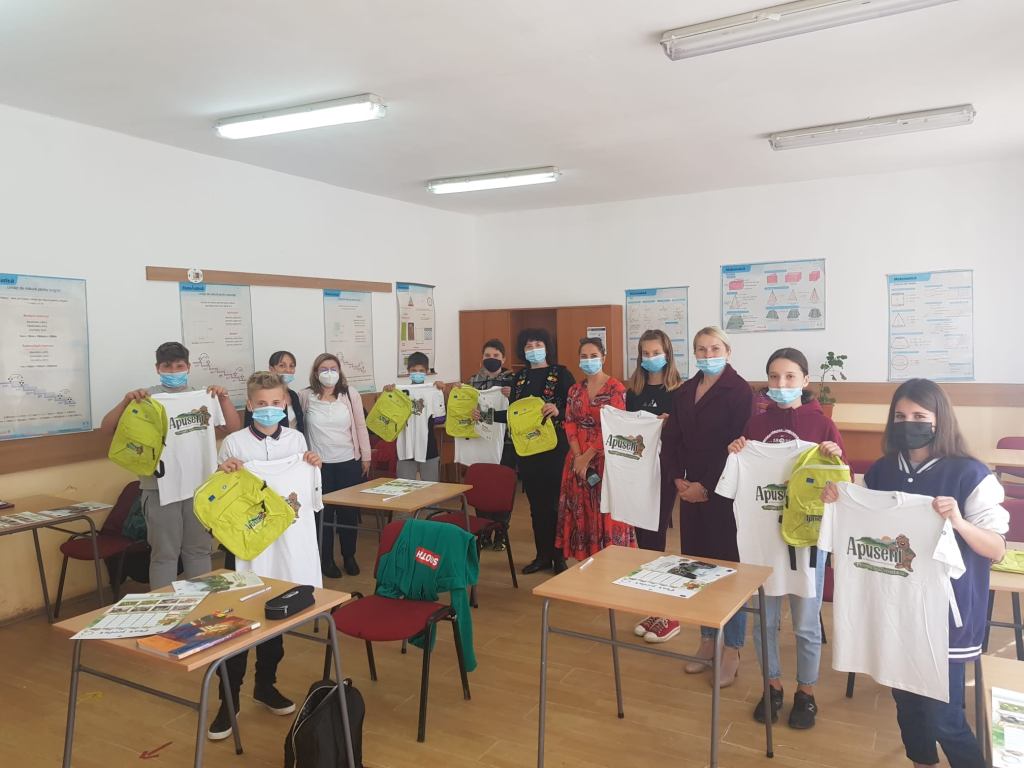 Au fost distribuite materialele promoţionale şi informative: ghiduri educative despre valorile ariilor naturale protejate din Apuseni, orare şcolare, tricouri personalizate pentru elevi, ghiozdane personalizate, diplome de participare, pixuri personalizate. Elevii au fost încântați de informațiile și cadourile primite!