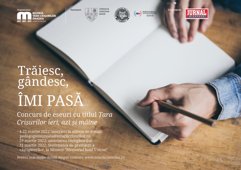 Muzeul Țării Crișurilor Oradea – Complex Muzeal, în parteneriat cu Consiliul Județean Bihor, Inspectoratul Școlar Județean Bihor, Universitatea Oradea și cu sprijinul Jurnalului Bihorean, lansează liceenilor și studenților din județul nostru invitația de a participa la concursul de eseuri Țara Crișurilor ieri, azi și mâine.