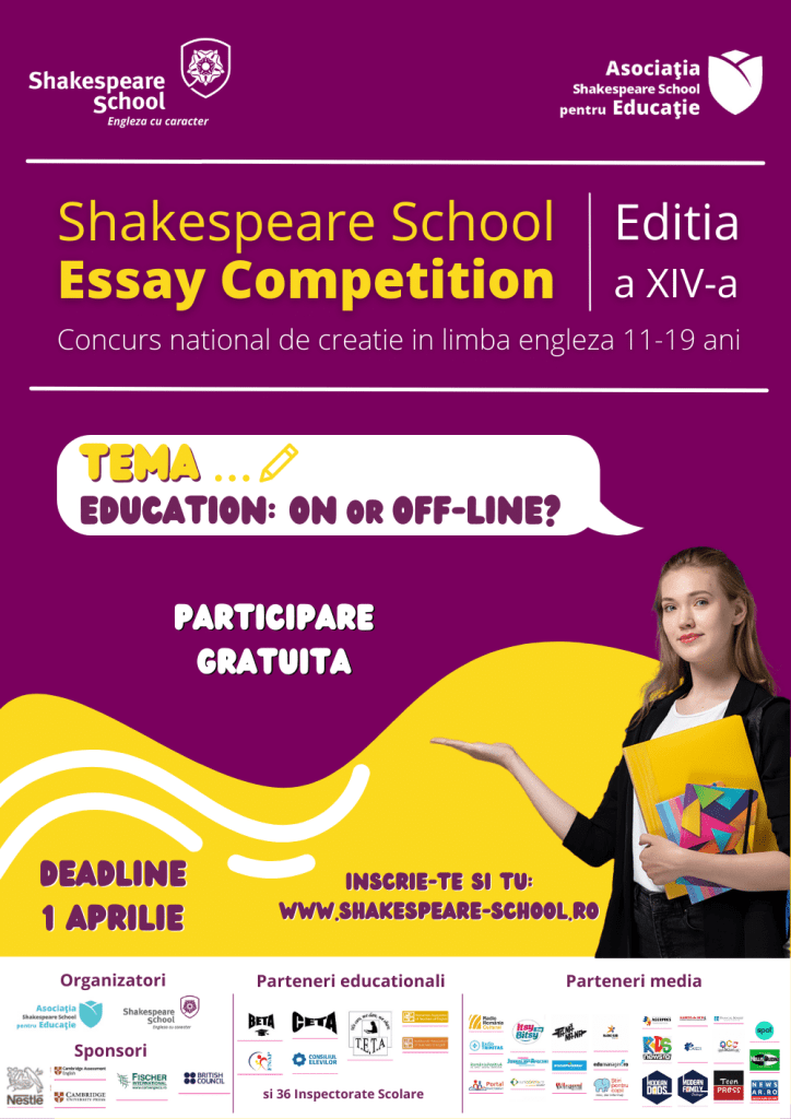 Shakespeare School Essay Competition este cel mai mare concurs de creație în Limba engleză din România. Dacă vă doriți ca și elevii dumneavoastră să fie recunoscuți drept cei mai tari la Engleză, atunci îi invităm să participe la un concurs de eseuri.