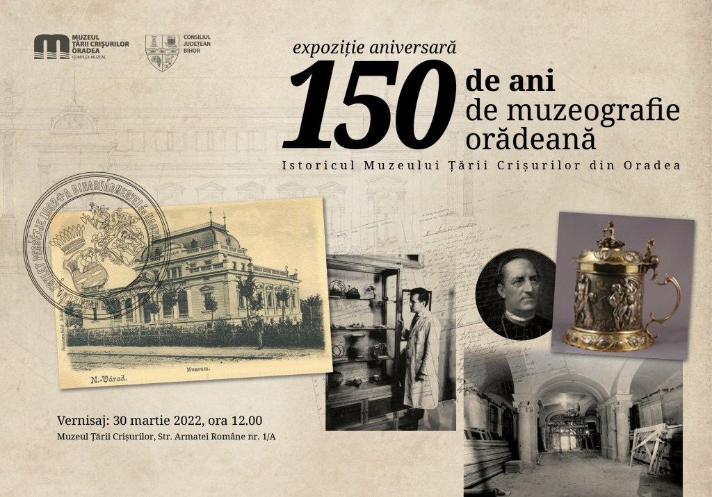 Muzeul Țării Crișurilor Oradea – Complex Muzeal, în parteneriat cu Consiliul Județean Bihor, organizează expoziția aniversară 150 de ani de muzeografie orădeană. Istoricul Muzeului Țării Crișurilor din Oradea, al cărei vernisaj va avea loc în 30 martie 2022, de la ora 12.00, la Muzeul Țării Crișurilor (Str. Armatei Române nr.1/A).