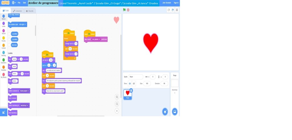 Profesorul de muzică, împreună cu diriginții claselor de la școli din oraș au diseminat printre elevi invitația de a participa la ateliere de lucru online organizat de Code School Club prin care gratuit ar avea oportunitatea de a învăța cum să confecționeze felicitare digitală utilizând aplicația Scratch. La atelierul online la care s-au înscris mulți, aș menționa clasele de la Liceul Teoretic „Aurel Lazăr”, Școala Gimnazială „Octavian Goga” și „Avram Iancu”. Acestea după ce au primit linkul de conectare distribuit de coordonatorii activităților de la propria școală: prof. Varodi-Bob Maria, Bondar Zita, Floriș Florina și Voicu Roxana au participat la însușirea limbajului de programare minimal pentru a realiza o felicitare digitală. Au urmat apoi ore de exerciții pe grupe și individual, prin care elevii au ajuns să aprofundeze cum funcționează programarea în Scratch. Jucându-se și-au însușit abilitatea de a programa mai în detaliu. Mare a fost satisfacția elevilor care au reușit să-și creeze propria felicitare digitală pe care de 8 Martie să o dea unei femei, unei persoane mult iubite din familie sau dintre profesoare. Demn de apreciat este interesul și plăcerea tuturor elevilor implicați în a creea, precum și bucuria de a vedea felicitările realizate. Aș dori totuși să marchez acel plus, adică extra devotamentul cu care s-au implicat elevii de la Liceul Teoretic „Aurel Lazăr” care sub imboldul dat de prof. de muzică au petrecut mult timp în fața calculatorului găsind noi metode de a îmbogăți felicitarea digitală astfel încât să poată fi o felicitare digitală muzicală. Cu mare pasiune au folosit programe de muzică care adăugate programului Scratch au făcut posibilă realizarea unei interesante felicitări digitale muzicale. Experiența lor de programare nu a fost ținută sub obroc, ci cu alte ore peste programul școlar, cu generozitate au distribuit albume, astfel încât în afară de elevii de la școlile menționate mai sus și alții au putut beneficia de rezultatul muncii lor. Ultima fază, dar nu cea mai neînsemnată a fost cea prin care în sala de clasă, elevii participanți de la toate școlile înscrise la atelier împreună cu profesorii coordonatori au prezentat colegilor de clasă aceste felicitările realizate. Dacă nu au fost implicați profesori de informatică, mare a fost provocarea și pentru profesorii coordonatori de a sta alături de elevi și a învăța cu ei, transmițând de la unii elevi mai mari acele așa-zis trucuri către cei mai mici, astfel încât, atunci când aceștia s-ar fi blocat și probabil abandona, au reușit să treacă cu brio peste dificultăți, iar la final au uitat de greutăți văzând cum în acest an postpandemic pot face ceva prin care pot aniversa Ziua Internațională a Femeii într-un mod inedit.