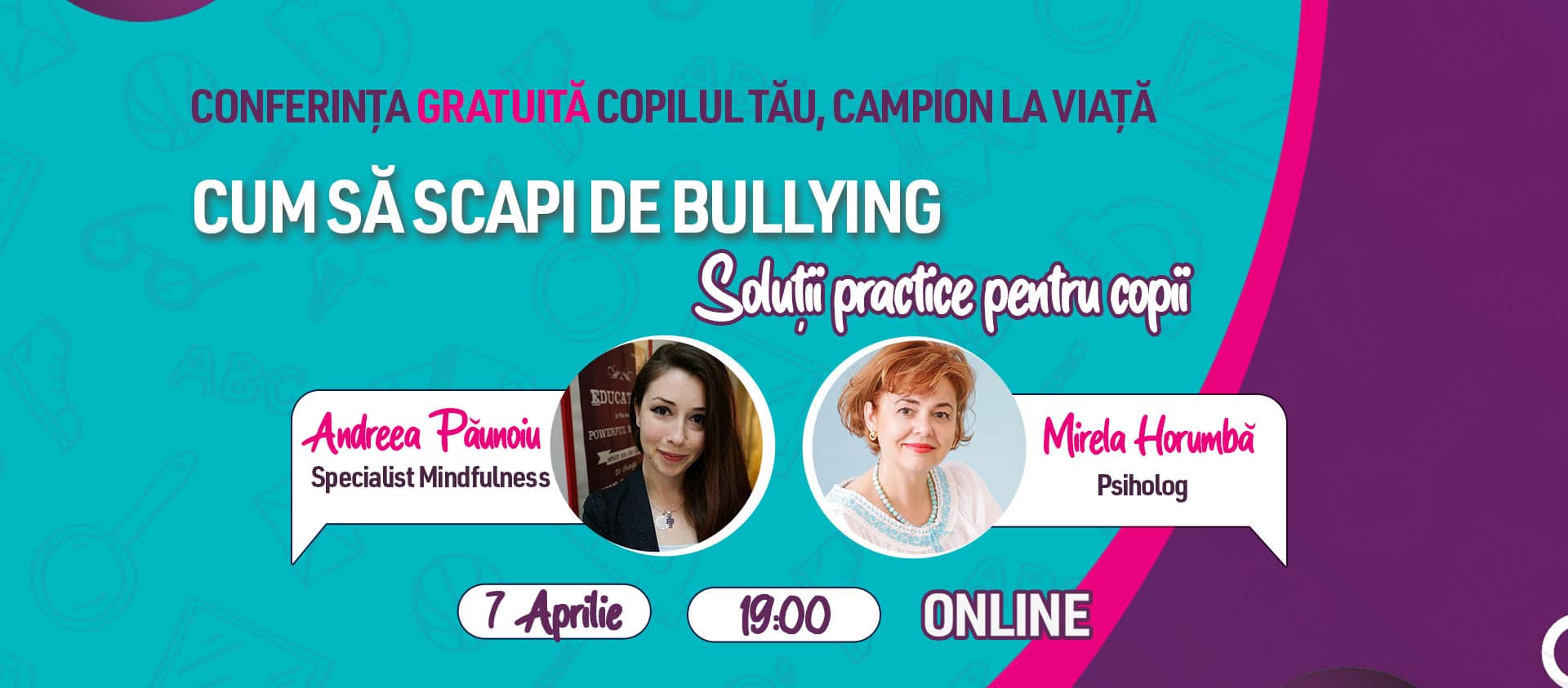 La solicitarea unui număr mare de părinți îngrijorați de fenomenul de bullying, care ia amploare, Shakespeare School organizează a noua întâlnire din ciclul conferințelor online Copilul tău, campion la viață, în care se va dezbate acest subiect. Întâlnirea va avea loc joi, 7 aprilie, de la ora 19:00, pe platforma Zoom. Înscrierea și participarea sunt gratuite.