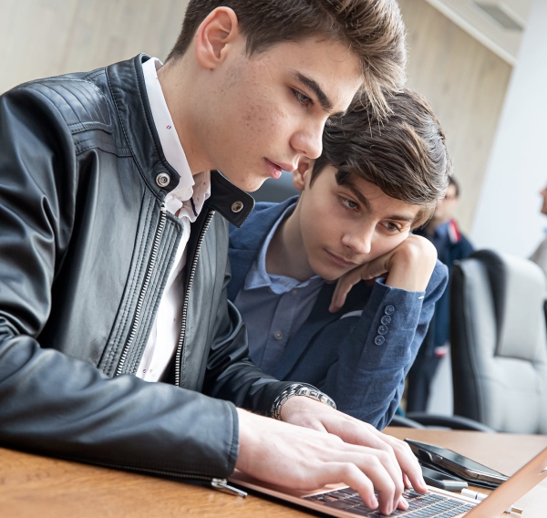 Elevi în clasa a IX-a, la profilul Matematică-Informatică, Vlad și Andrei sunt pregătiți și îndrumați la clasă de dna Mirela Voinea, profesor de informatică.