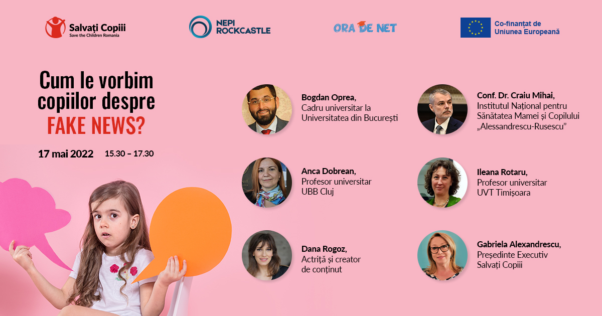 Organizația Salvați Copiii și NEPI RockCastle lansează astăzi o serie de activități interactive gratuite, pentru părinți și copii, prin conferința „Cum le vorbim copiilor despre FAKE NEWS?”, transmisă LIVE pe paginile de Facebook Salvați Copiii România și Ora de Net (poate fi accesată aici: https://www.facebook.com/events/411631230522873?ref=newsfeed), începând cu ora 15.30.