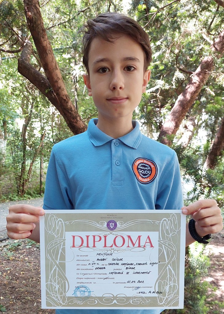 În clasa a VII-a, în acest an școlar, efortul depus a fost mult mai mare, deoarece am participat și la alte olimpiade, atât la nivel județean, cât și național. Munca mea a fost răsplătită cu un rezultat frumos la etapa națională a Olimpiadei de Informatică, adică locul 7 pe țară, mențiune cu medalie de aur și calificare la proba de selecție a lotului național de juniori. Nu aș fi putut obține astfel de rezultate fără pasiune, perseverență și fără ajutorul doamnei profesoare Matei Corina și cel al părinților, care mi-au oferit toate informațiile necesare și, mai ales, suport moral în fiecare zi.”