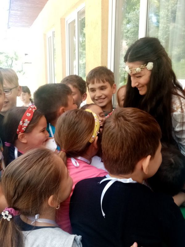 În această imagine se poate observa cum o mulțime de copii îmbrățișează o fată. La finalul activităților, elevii de la Școala din Ponița i-au sărit în brațe Doamnei Bucuria, fiind plini de fericire și recunoștință datorită activităților desfășurate împreună. Prin această îmbrățișare, copiii demonstrează simpatie și afecțiune față de studentă, fiind o modalitate nonverbală prin care copiii își exprimă bucuria de a fi participat la activități. Această situație există deoarece pe parcursul activităților, copiii au avut ocazia să interacționeze cu studentele, se vorbească despre propria persoană, să se recreeze, să desfășoare activități diferite și chiar unice din care au avut multe de învățat și, nu în ultimul rând, s-au distrat împreună, fapt care le-a dat ocazia să creeze legături strânse cu studentele, motiv pentru care nu au vrut să își ia rămas bun de la ele fără să le ofere o ultimă îmbrățișare celor care le-au adus un strop de bucurie în inimile lor. Îmbrățișarea pe care studenta a primit-o de la copii la finalul activității poate fi văzută ca un feedback pozitiv prin care aceștia își exprimă satisfacția și mulțumirea față de activitate, gest care contribuie semnificativ asupra stării de bine a studentelor. Să fim cât mai deschiși în a le oferi copiilor îmbrățișări astfel încât să creăm un cadru afectiv în care copiii să se simtă liberi să ofere la rândul lor îmbrățișări.