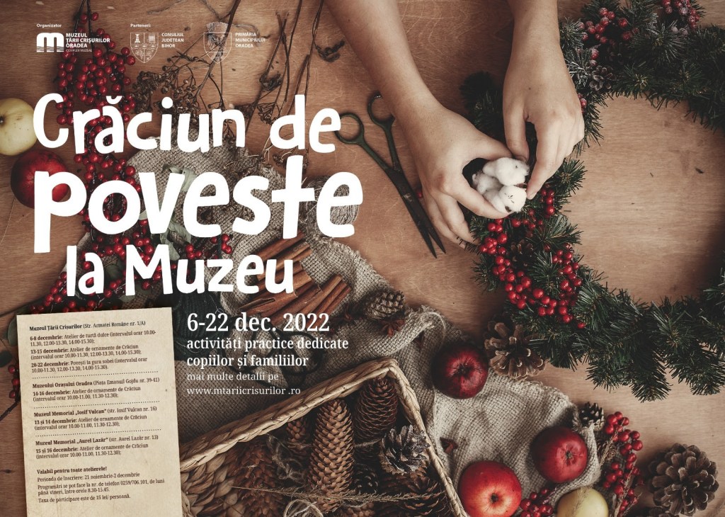 Muzeul Țării Crișurilor Oradea – Complex Muzeal, în parteneriat cu Consiliul Județean Bihor, Primăria Municipiului Oradea, Inspectoratul Școlar Județean Bihor și Asociația „Prietenii Muzeului Țării Crișurilor”, organizează în perioada 6-22 decembrie a.c. o serie de activități dedicate sărbătorilor de iarnă, adresate elevilor din învățământul preșcolar, primar, gimnazial și liceal, precum și familiilor.
