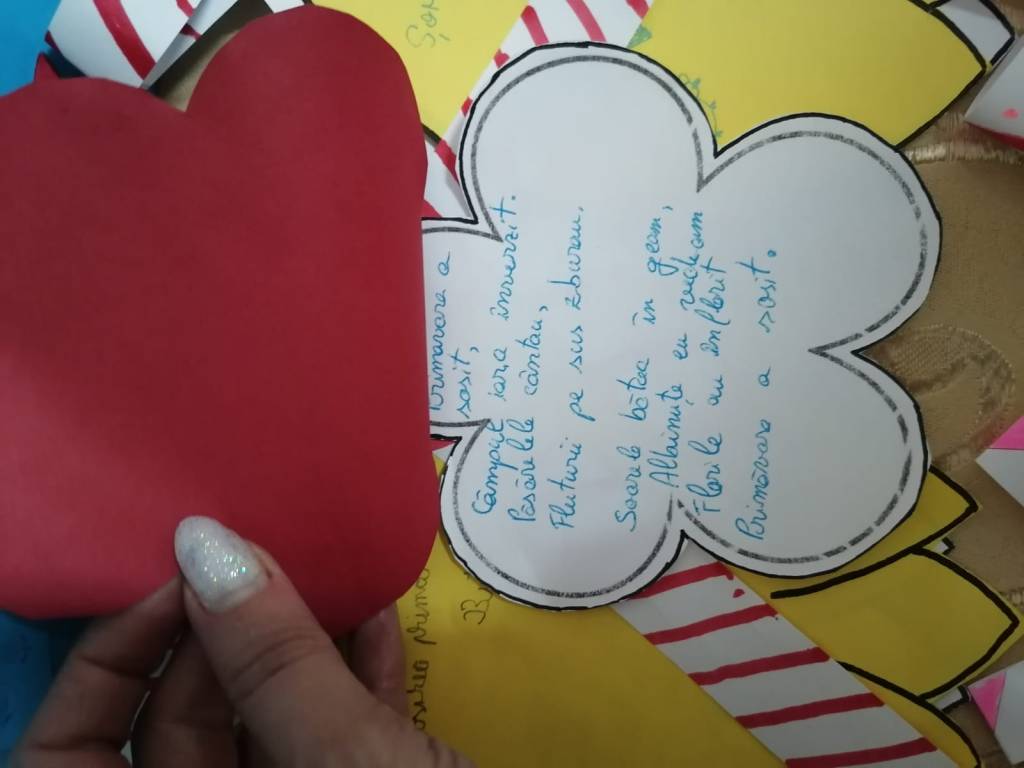 A doua activitate a reprezentat-o Cercul de lectură „Slova de foc”, devenit o tradiție de mulți ani în școala noastră. La această activitate elevii s-au delectat, pentru început, tot cu texte lirice, dar tema a fost primăvara. Soarele a fost în asentimentul nostru și pe întreaga durată a activității și-a trimis razele, încă slabe și palide, pentru a ne ajuta să trăim și să simțim versurile recitate de către participanți. Și, pentru ca primăvara să-și facă simțită prezența pe deplin, elevii au realizat creații în versuri și le-au scris pe ghiocei, fluturași, buburuze și floricele, rugând-o pe doamna Primăvară să se instaleze pe deplin.