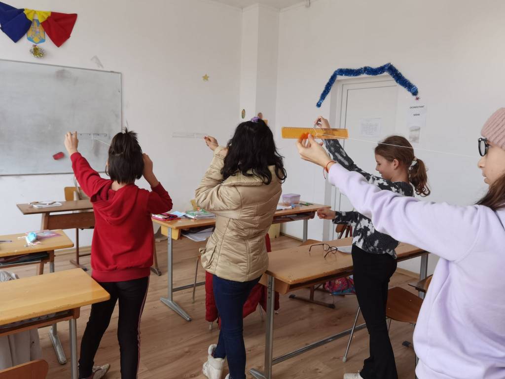Fotografii din anul școlar 2021-2022, în care elevii utilizează cadranul-pistol, instrument de măsurat unghiurile, și tabla smart, împreună cu microscopul. Sursă imagini: fototeca personală Camelia Rusu