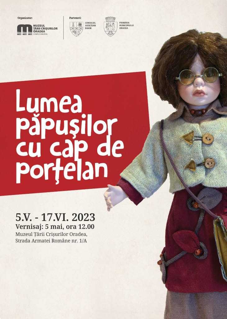 Muzeul Țării Crișurilor Oradea – Complex Muzeal organizează, în parteneriat cu Consiliul Județean Bihor și Primăria Municipiului Oradea, vernisajul expoziției Lumea păpușilor cu cap de porțelan, care va avea loc vineri, 5 mai 2023, ora 12.00, la sediul instituției din Str. Armatei Române nr.1/A, sala de expoziții temporare a Secției de Etnografie (et. III).