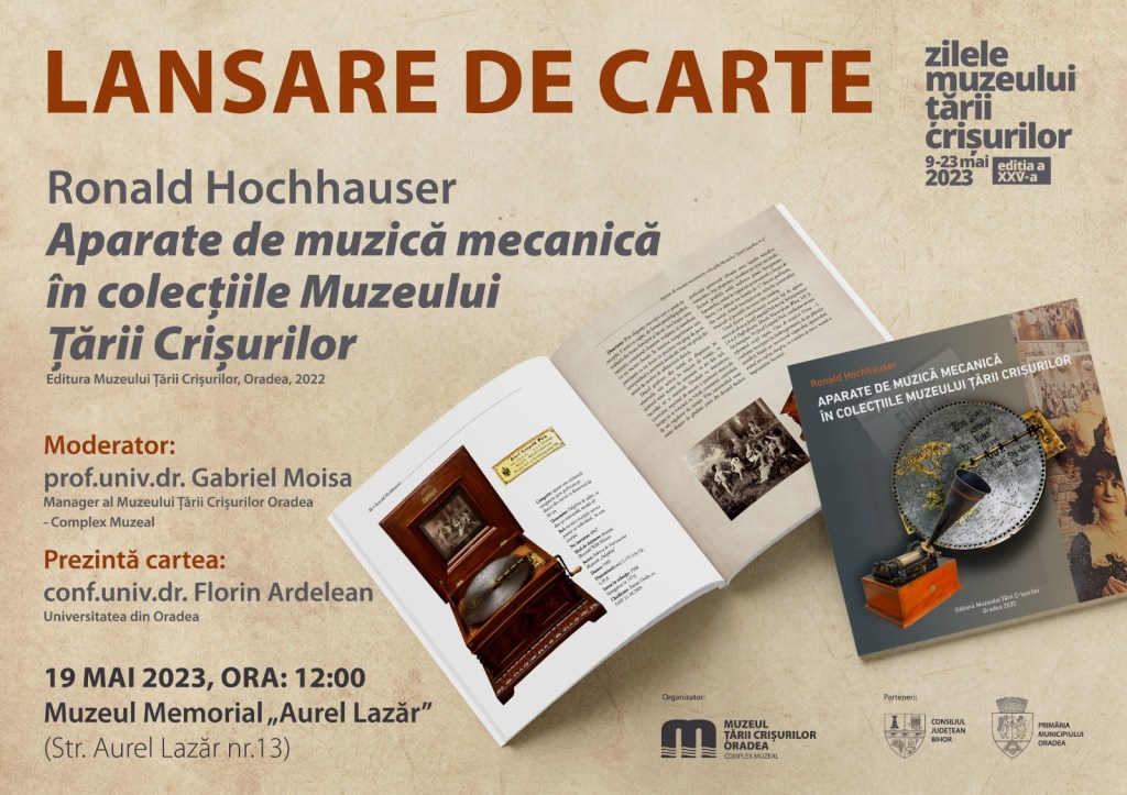 Muzeul Țării Crișurilor Oradea – Complex Muzeal organizează, în parteneriat cu Consiliul Județean și Primăria Municipiului Oradea, lansarea cărții Aparate de muzică mecanică în colecțiile Muzeului Țării Crișurilor, autor Ronald Hochhauser, publicată în Editura Muzeului Țării Crișurilor, Oradea, 2022.