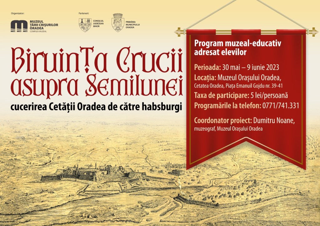 În perioada 30 mai – 9 iunie 2023, la Secția Muzeul Orașului Oradea, din cadrul Muzeului Țării Crișurilor – Complex Muzeal, se va desfășura programul muzeal-educativ Biruința Crucii asupra Semilunei – cucerirea Cetății Oradea de către habsburgi, adresat elevilor din învățământul preuniversitar.