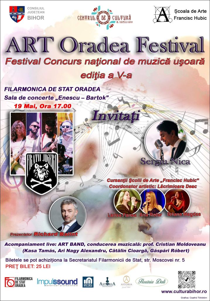 Centrul de Cultură al Judeţului Bihor, prin Şcoala de Arte Francisc Hubic, vă invită la Festivalul-concurs naţional de muzică uşoară Art Oradea Festival, ediţia a V-a, în data de 19 mai 2023, la Filarmonica de Stat din Oradea, începând cu ora 17:00.