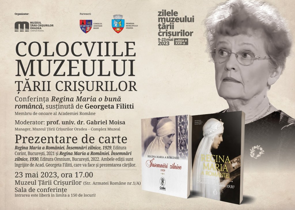 Muzeul Ţării Crişurilor Oradea – Complex Muzeal, împreună cu Facultatea de Istorie, Relaţii Internaţionale, Ştiinţe Politice şi Ştiinţele Comunicării, Centrul de Studii Interdisciplinare Oradea-Chișinău al Academiei Române și Școala Doctorală de Istorie a Universității din Oradea, în parteneriat cu Consiliul Județean Bihor și Primăria Municipiului Oradea, organizează conferința Regina Maria o bună româncă, susținută de către Georgeta Filitti, membră de onoare a Academiei Române. Evenimentul face parte din Zilele Muzeului Țării Crișurilor, ediția a XXV-a și va avea loc marți, 23 mai 2023, de la ora 17.00, la Muzeul Țării Crișurilor (Str. Armatei Române nr.1/A), Sala de conferințe.