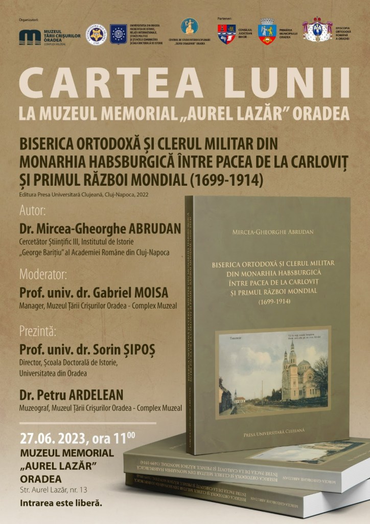 Muzeul Țării Crișurilor Oradea – Complex Muzeal organizează, împreună cu Universitatea din Oradea – Facultatea de Istorie, Relații Internaționale și Științe Politice, Școala Doctorală de Istorie, Centrul de Studii Interdisciplinare Silviu-Dragomir și în parteneriat cu Consiliul Județean Bihor, Primăria Municipiului Oradea și Episcopia Ortodoxă Română a Oradiei, lansarea cărții Biserica Ortodoxă și clerul militar din Monarhia Habsburgică între Pacea de la Carloviț și Primul Război Mondial (1699-1914).