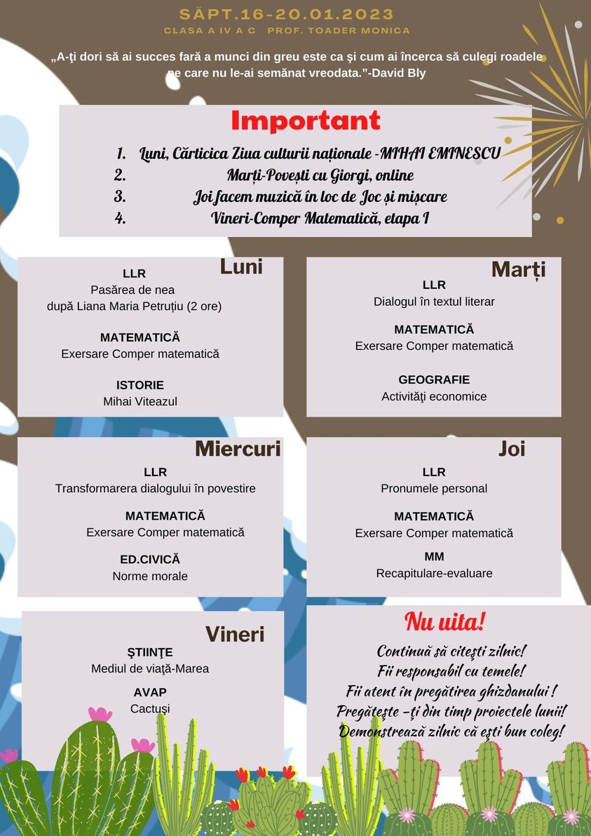 Tot uitându-mă în cufărul amintirilor generaţiei de elevi (cu muuulte fotografii) ce abia şi-a luat rămas-bun de la primii cinci ani de şcoală, de la ciclul primar, am dat de ceva ce am considerat şi consider în continuare ca făcând nu numai parte din rutina săptămânală a colectivului nostru, ci având şi multe atuuri în planificarea, organizarea şi evaluarea activităţii zilnice la clasă. Newsletter-ul unei săptămâni cuprindea de obicei: titlul lecțiilor la fiecare disciplină, câteva aspecte importante de care trebuia să ținem cont, noutățile săptămânii, un citat sugestiv ce ne doream a fi motto-ul clasei, câteva elemente simbol care să ne atragă atenţia asupra principalelor subiecte / teme abordate etc.