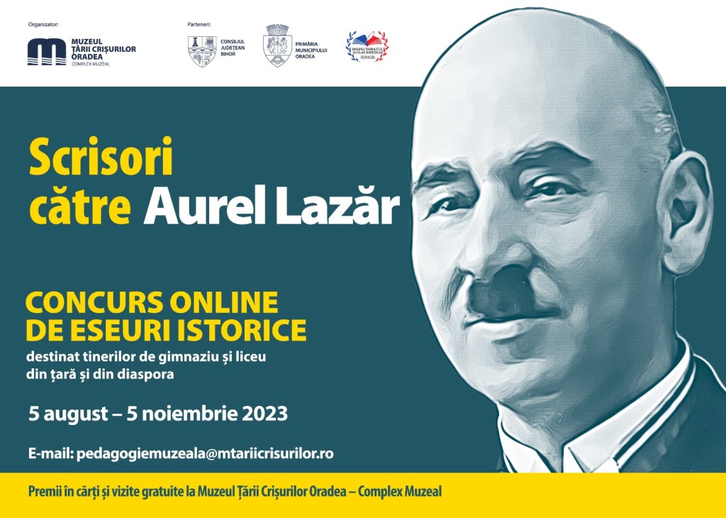 În parteneriat cu Consiliul Județean Bihor, Primăria Municipiului Oradea și Inspectoratul Școlar Județean Bihor, Muzeul Țării Crișurilor Oradea – Complex Muzeal organizează un nou concurs online de eseuri istorice, cu tema Scrisori către Aurel Lazăr. Acest program este destinat tinerilor de gimnaziu și liceu din țară și din diaspora.