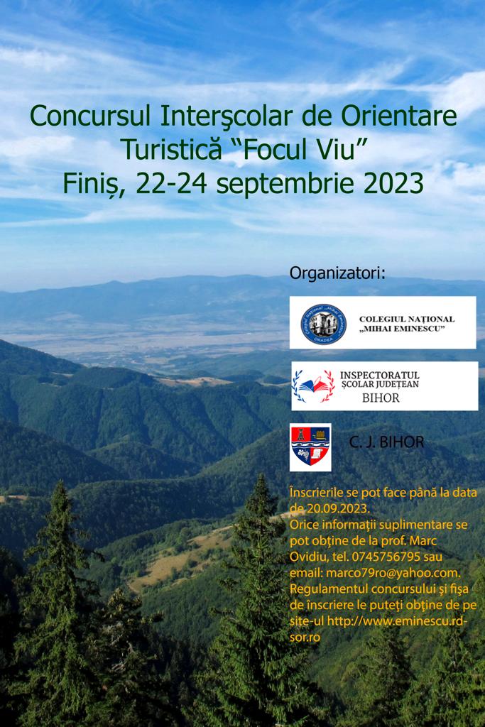 Colegiul Național Mihai Eminescu din Oradea, împreună cu ISJ Bihor, vă invită să luaţi parte la Concursul interşcolar de orientare turistică Focul Viu, parte a proiectului Un pas pe munte, un pas spre sănătate, finanțat de Consiliul Județean Bihor, care se va desfăşura în perioada 22-24 septembrie 2023, la Finiș.
