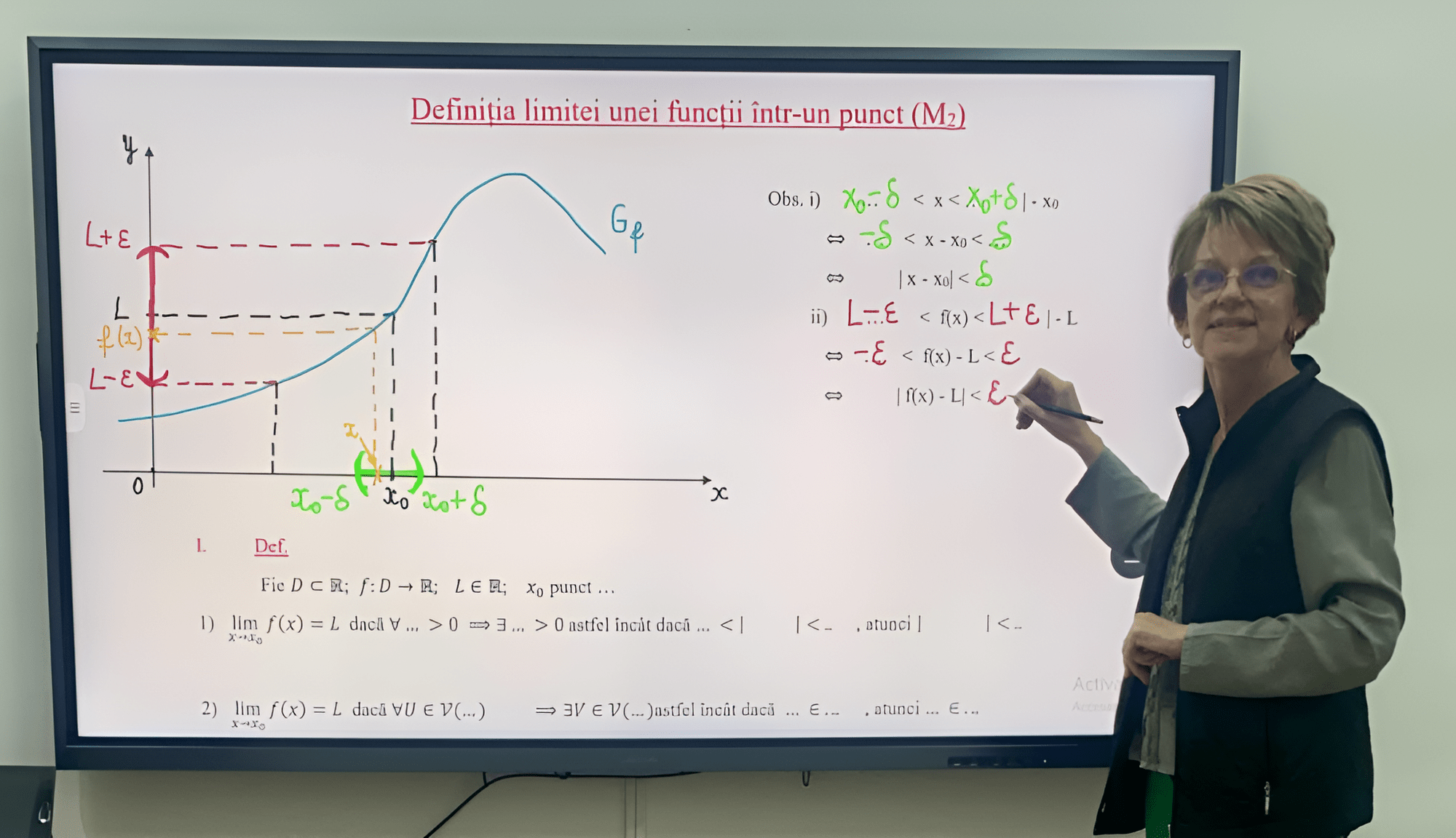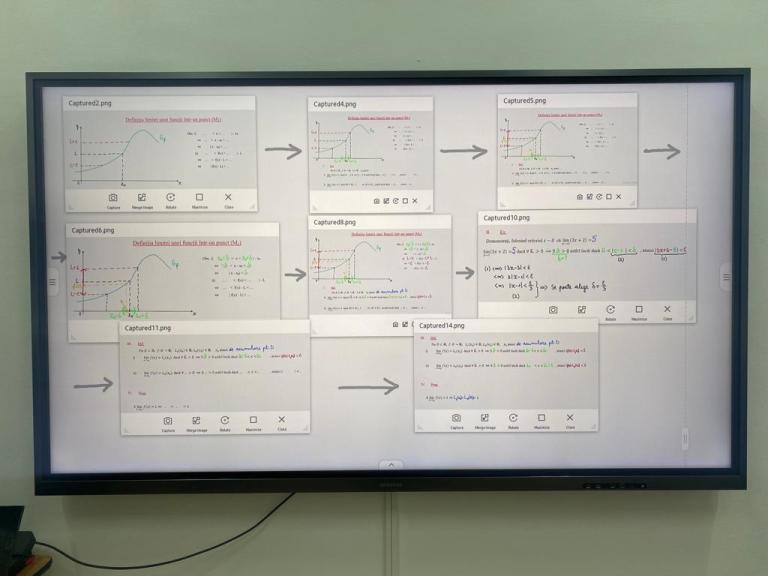 După completarea definiției cu criteriul epsilon – delta și cu criteriul cu vecinătăți, a urmat o aplicare directă a definiției și apoi introducerea conceptelor de limite laterale. În timpul activității se pot realiza la tabla interactivă capturi succesive de ecran cu diferite etape ale lecției, etape care pot fi apoi cu ușurință accesate pentru fixarea noțiunilor.