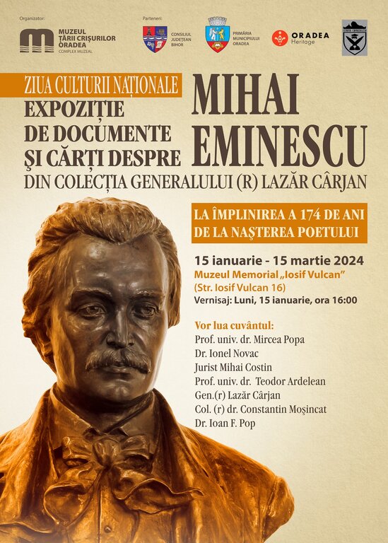 Cu prilejul Zilei Culturii Naționale și a împlinirii a 174 de ani de la nașterea poetului nostru național, care dă simbolistica acestei zile, Muzeul Țării Crișurilor Oradea – Complex Muzeal, în parteneriat cu Consiliul Județean Bihor, Primăria Municipiului Oradea, Cetatea Cavalerilor și Oradea Heritage, organizează în data de 15 ianuarie a.c., ora 16.00, la sediul Muzeului Memorial Iosif Vulcan (str. Iosif Vulcan nr. 16), o retrospectivă expozițională de carte de și despre Mihai Eminescu din colecția Gen. (r) Lazăr Cârjan.