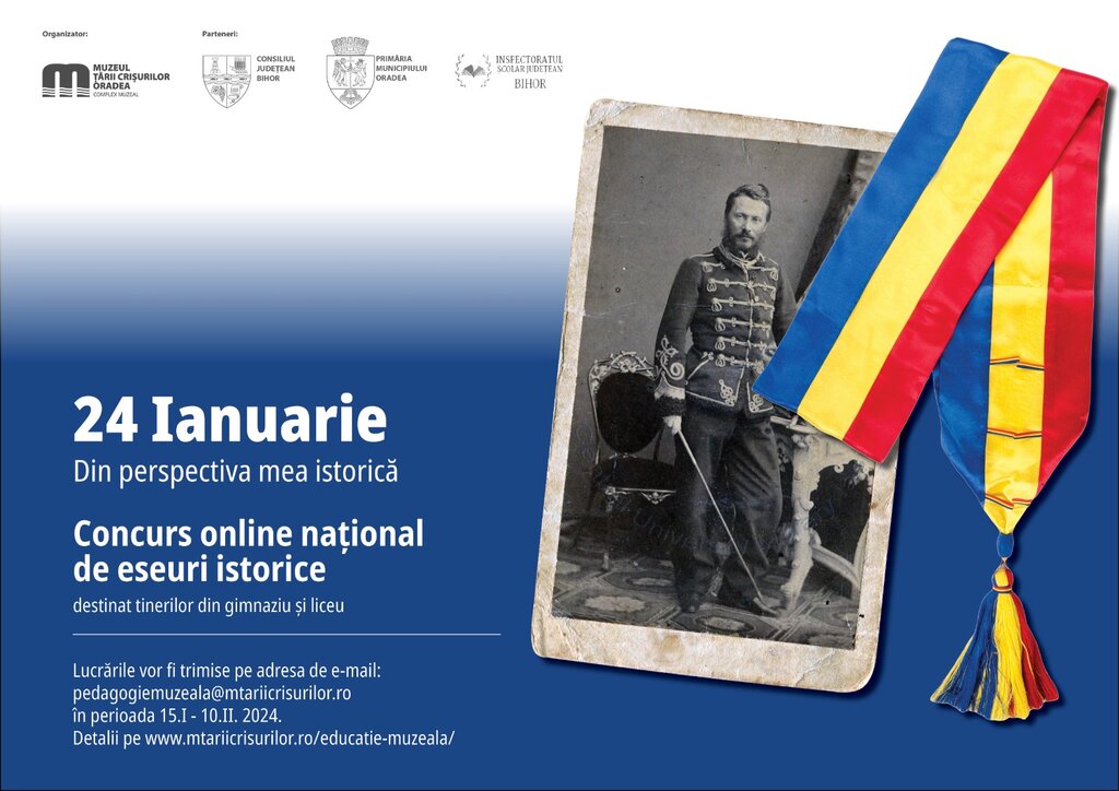 Muzeul Țării Crișurilor Oradea – Complex Muzeal organizează în parteneriat cu Consiliul Județean Bihor, Primăria Municipiului Oradea, Universitatea din Oradea și Inspectoratul Școlar Județean Bihor, o nouă ediție a concursului online de eseuri istorice, având tema 24 ianuarie din perspectiva mea istorică, care este destinat tinerilor de gimnaziu și liceu.