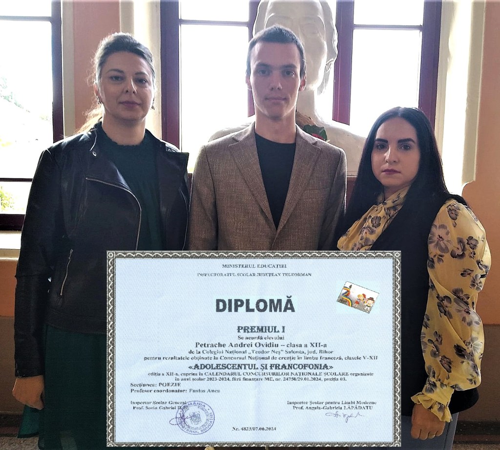 Juriul Concursului național de creație literară în limba franceză L’adolescent et la francophonie a desemnat laureații Ediției a XII – 2024. Elevul bihorean Andrei Ovidiu Petrache de la Colegiul Național Teodor Neș din Salonta a ocupat Locul I (Premiul I) la secțiunea Poezie în limba franceză. Reușita tânărului absolvent de clasa a XII-a confirmă, încă o dată, talentul premiat tot cu Locul I, la Paris, în urmă cu doi ani.