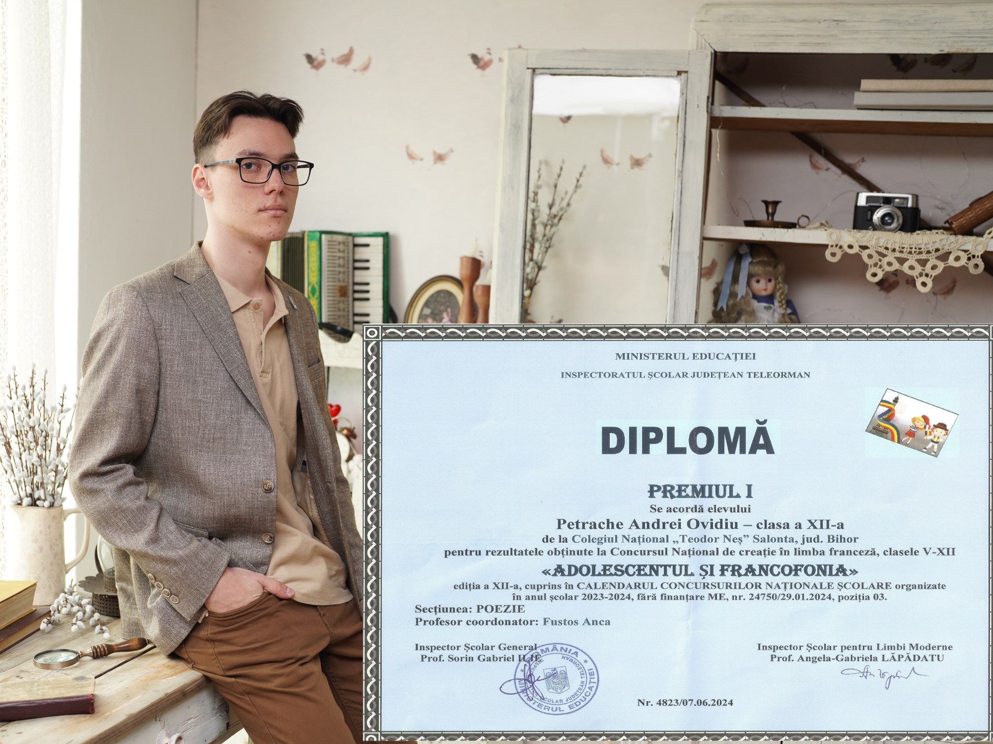 Andrei Ovidiu Petrache, care este șeful Promoției 2020-2024 (media generală 10), adaugă acest Premiu I la palmaresul succesului său literar care numără peste 40 de distincții internaționale, naționale și județene obținute în cei patru ani de liceu.