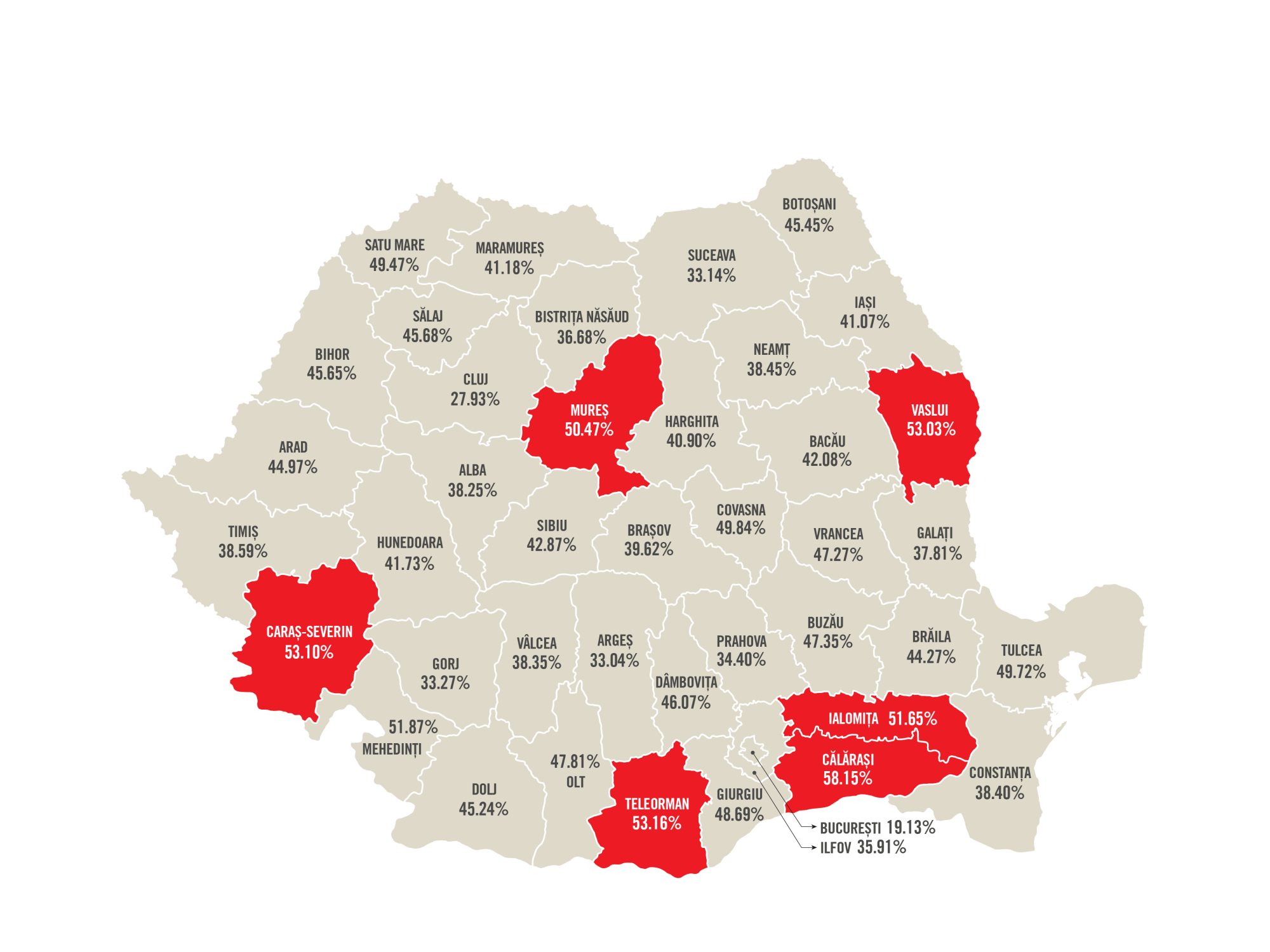 După contestații, rezultatele finale ale Evaluării Naționale arată că trei din cinci copii intrați în școală acum nouă ani au reușit să obțină medii peste 5. Situația în plan teritorial este și mai îngrijorătoare. În timp ce, la nivel național, ponderea elevilor înscriși în clasa pregătitoare acum nouă ani și care nu au ajuns până la finalul clasei a VIII-a este de puțin peste 15%, în plan teritorial există discrepanțe foarte mari, existând județe unde nivelul acestui indicator se apropie sau depășește pragul de un sfert dintre elevii înscriși la școală: Giurgiu (27,26%), Călărași (25,9%), Covasna (24,51%).