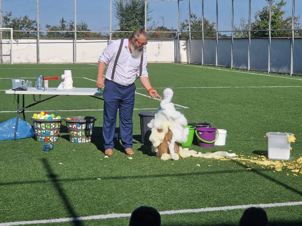 Asociația Culturală Teatrul de Copii din Oradea, prin Proiectul Profu’ Zăpăcit, mai exact, actorul Șerban Borda, a dat curs invitației noastre și a prezentat un spectacol inedit, interactiv, original și educativ, în care spectatorii (elevi, profesori, aparținători etc.) și-au putut verifica sau și-au însușit, după caz, cunoștințe elementare de fizică și chimie. La acest spectacol au fost invitați toți elevii școlii noastre.