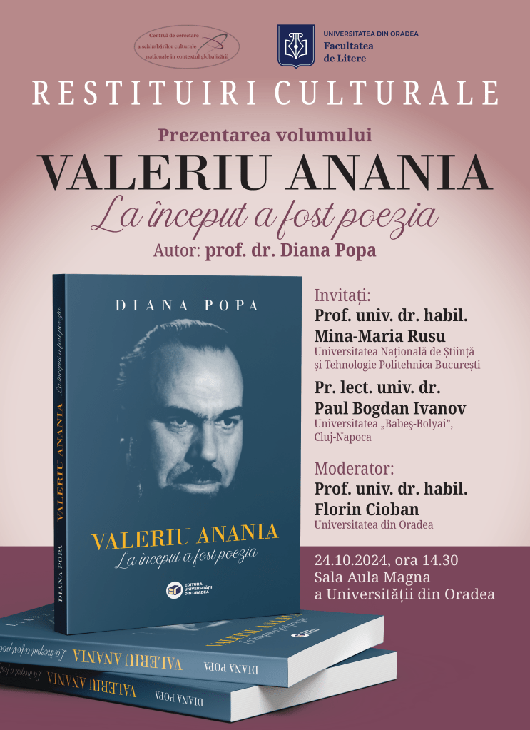 Joi, 24 octombrie 2024, la ora 14.30, în Aula Magna a Universității va avea loc, în organizarea Centrului de Certare a Schimbărilor Culturale Naționale în Contextul Globalizării (CCSCNG), al Facultății de Litere, prezentarea volumului Valeriu Anania – la început a fost poezia.