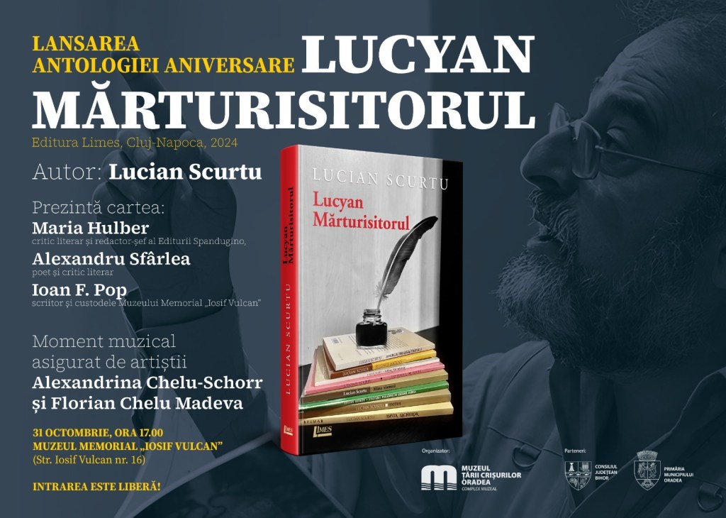 Muzeul Țării Crișurilor Oradea – Complex Muzeal, în parteneriat cu Consiliul Județean Bihor și Primăria Municipiului Oradea, organizează la Muzeul Memorial „Iosif Vulcan” (str. Iosif Vulcan nr. 16), în ziua de joi, 31 octombrie, a.c., ora 17.00, lansarea antologiei aniversare a cunoscutului poet orădean, Lucian Scurtu.