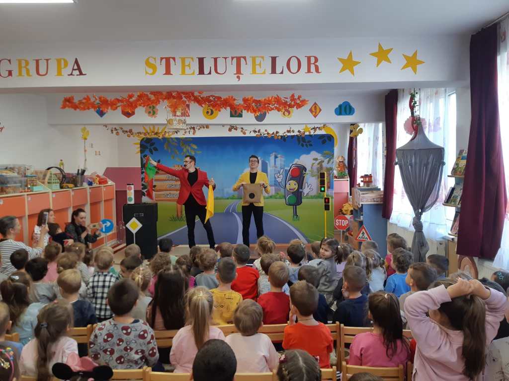 După ce au fost trup și suflet părtași ai momentelor de divertisment, copiii au ieșit în curtea grădiniței, unde au avut parte de încă o surpriză plăcută: doi polițiști ai Poliției Rutiere i-au așteptat cu o mașină cu sirenă pe care le-au prezentat-o, vorbindu-le despre importanța cunoașterii și a respectării regulilor de circulație.