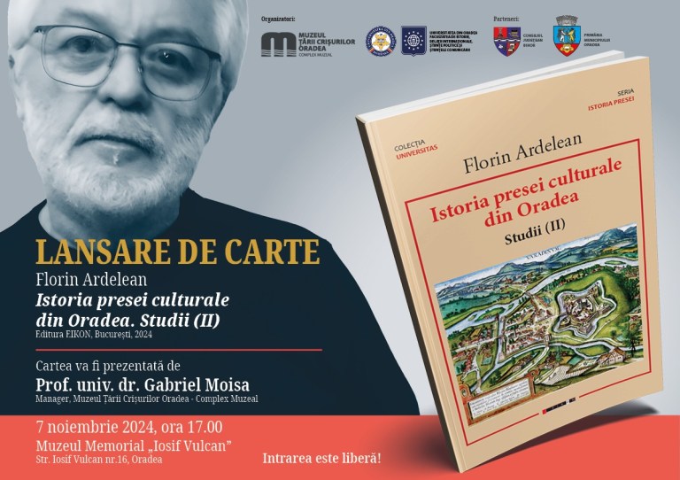 Muzeul Țării Crișurilor Oradea – Complex Muzeal organizează, cu sprijinul Consiliului Județean Bihor și al Primăriei Municipiului Oradea, lansarea cărții Istoria presei culturale din Oradea. Studii (II), al cărei autor este Florin Ardelean și care a apărut la Editura Eikon, București, 2024.