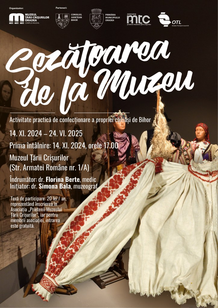 Muzeul Țării Crișurilor Oradea – Complex Muzeal, în parteneriat cu Consiliul Județean Bihor, Primăria Municipiului Oradea, Asociația „Prietenii Muzeului Țării Crișurilor” și OTL SA organizează o nouă Șezătoare la muzeu, activitate care se înscrie în proiectul de revitalizare a cămășii vechi românești ce se purta pe meleagurile crișene și la care invităm publicul interesat să participe.