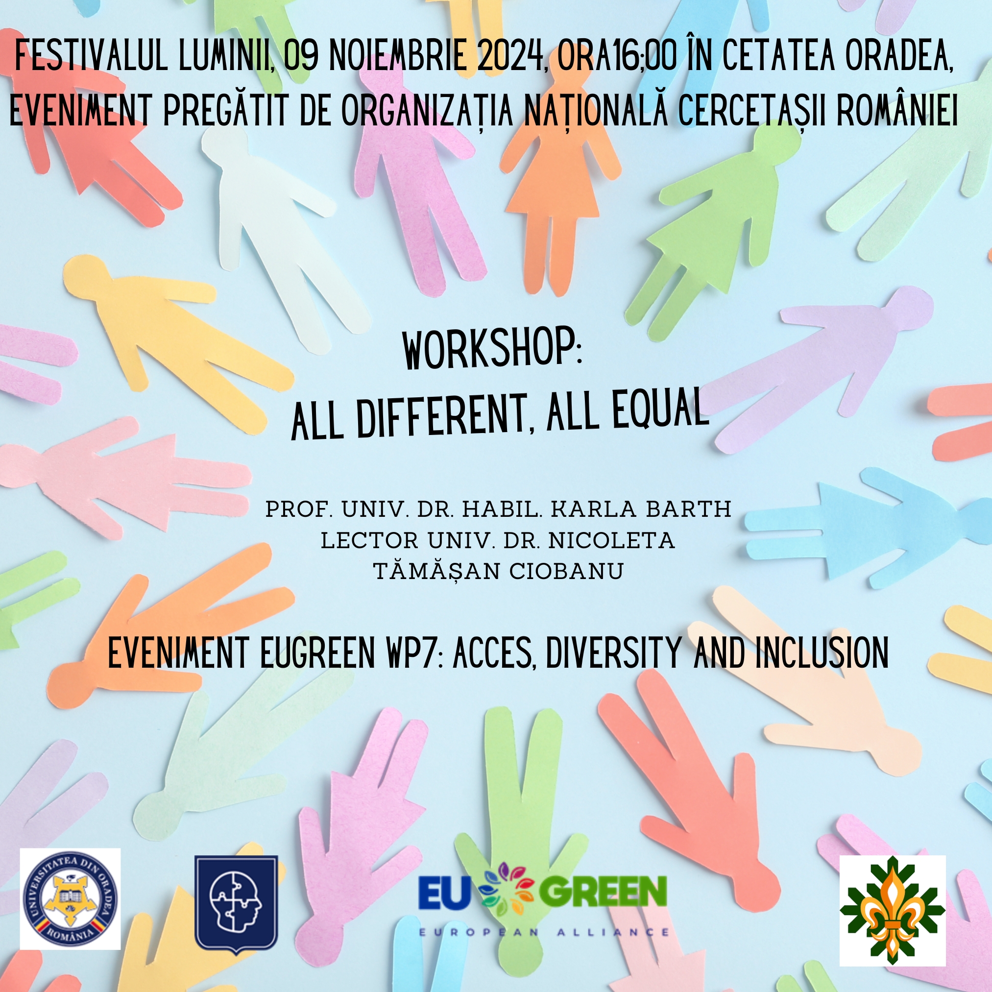 La solicitarea tinerilor organizatori, Universitatea din Oradea va susține două workshop-uri: „All Different, All Equal” și „A Day Without Paper Waste”. Primul este parte a activităților grupului de lucru (WP) „Acces, Diversitate și Incluziune” al EU GREEN și își propune să promoveze diversitatea. Workshop-ul este susținut de prof.univ. dr. habil Karla Barth și lect. univ. dr. Nicoleta Tămășan Ciobanu. „Scopul nostru este acela de a dezvolta abilități și de a încuraja discuții constructive, având în vedere contribuția fiecăruia la o societate mai echitabilă. Atelierul se va concentra pe promovarea accesului egal și a diversității, fiind deschis publicului larg”, a precizat prof. univ. dr. habil. Karla Barth, coordonatoarea grupului de lucru „Acces, diversitate și Incluziune” la nivelul Universității din Oradea.