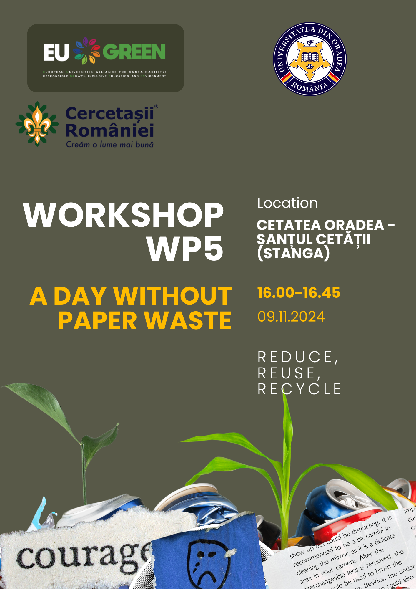 Cel de-al doilea atelier, organizat de WP 5 „Engagement” al EU GREEN, își propune să atragă atenția asupra problemelor legate de risipa de hârtie și impactul acestui fenomen asupra mediului. „Workshop-urile sunt gândite pentru a sprijini activ comunitatea în eforturile sale de incluziune și coeziune socială”, afirmă prof. univ. dr. habil. Anca Dodescu, prorector al Universității din Oradea și coordonator al activităților EU GREEN la nivelul instituției academice.