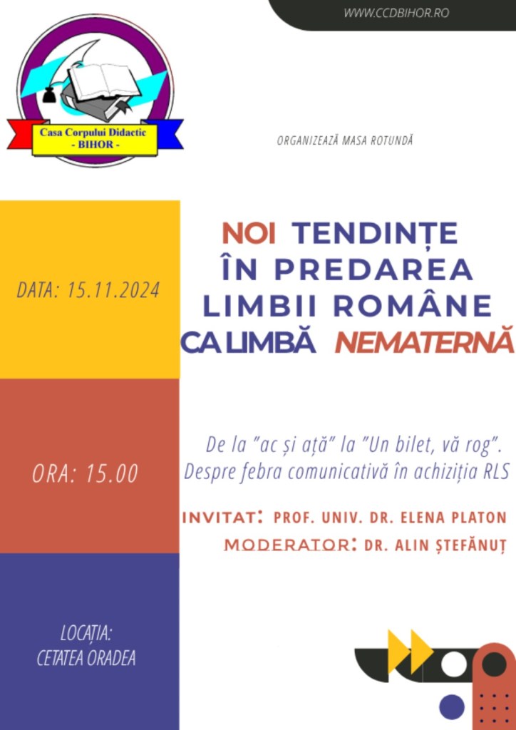 Vineri, 15 noiembrie 2025, de la ora 15:00, în Cetatea Oradea, corpul C, et. II, sala 6, Casa Corpului Didactic a Județului Bihor organizează masa rotundă Noi tendințe în predarea limbii române ca limbă nematernă.