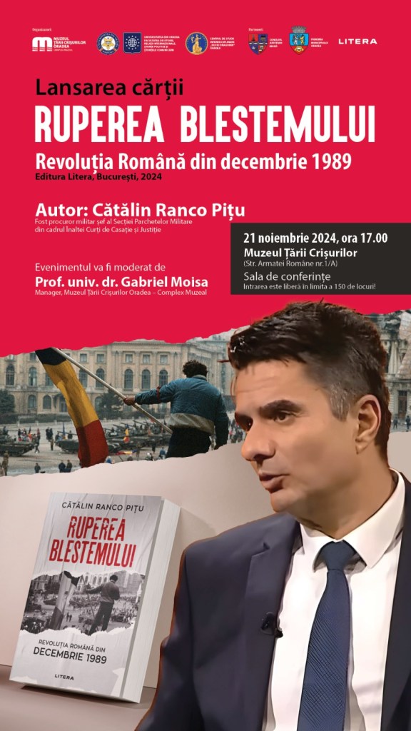 Muzeul Țării Crișurilor Oradea – Complex Muzeal în parteneriat cu Universitatea din Oradea – Facultatea de Istorie, Relații Internaționale, Științe Politice și Științele Comunicării, Centrul de Studii Interdisciplinare „Silviu Dragomir” Oradea și Editura Litera, cu sprijinul Consiliului Județean Bihor și al Primăriei Municipiului Oradea, organizează lansarea cărții Ruperea blestemului | Revoluția Română din decembrie 1989, susținută de către Cătălin Ranco Pițu, autorul cărții și fost procuror militar șef al Secției Parchetelor Militare din cadrul Înaltei Curți de Casație și Justiție.