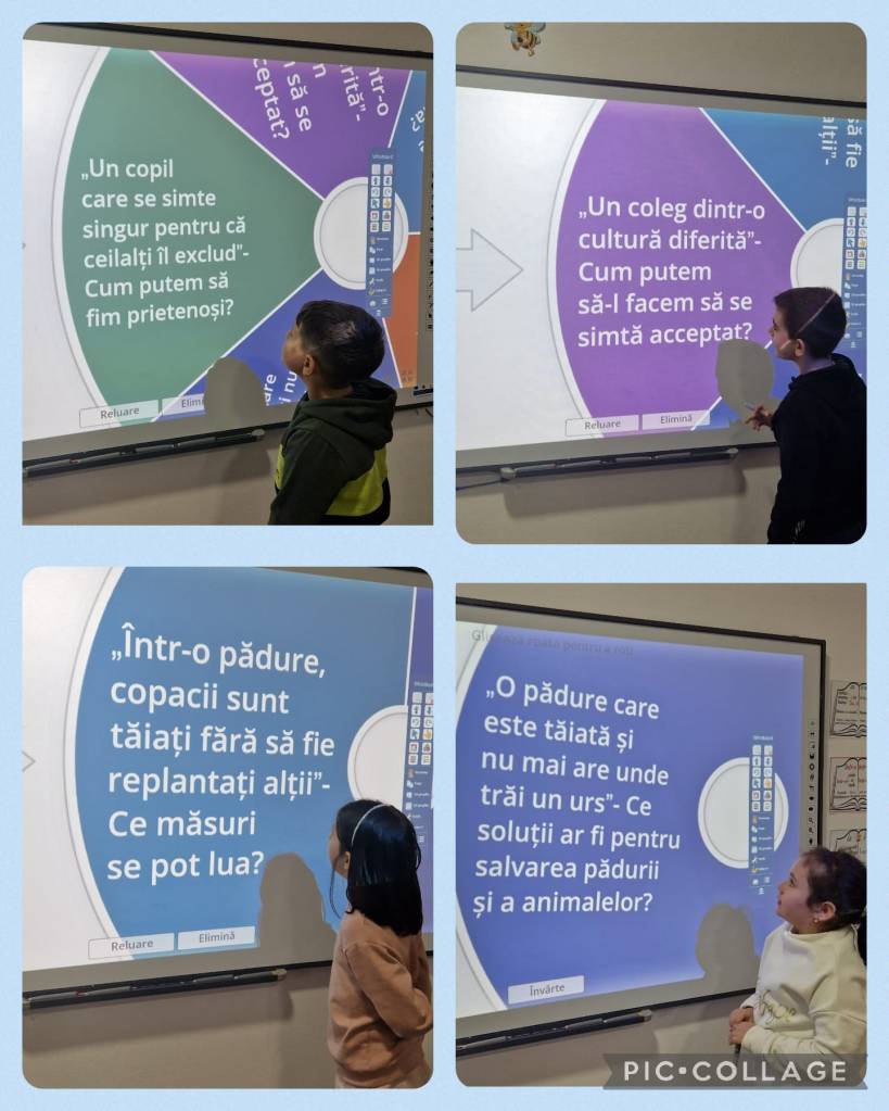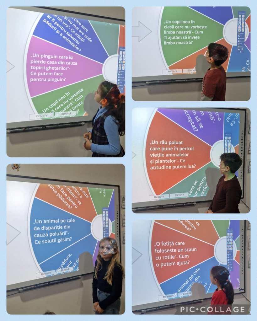 Elevii s-au așezat în cerc, iar cu ajutorul unui joc creat în wordwall, fiecăruia i s-a potrivit o situație, cum ar fi: Un copil care vorbește altă limbă decât noi; Un animal pe cale de dispariție din cauza poluării; O fetiță care folosește un scaun cu rotile; O pădure care este distrusă pentru a construi clădiri etc.