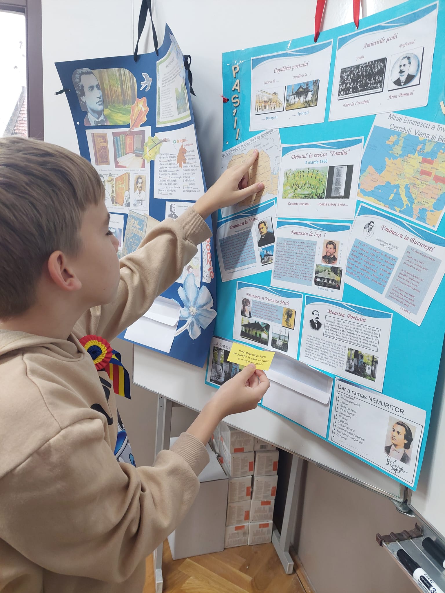 În preajma datei de 15 ianuarie 2024, am sărbătorit nașterea Poetului Național, Mihai Eminescu, i-am adus un omagiu celui care este considerat Luceafărul poeziei românești, căruia i-am descoperit parte din pașii prin viață și prin literatură. Cu sufletele bucurate de ceea ce am aflat și de minunatele sale versuri, elevii au interacționat apoi cu colegii lor mai mari, în timpul pauzei mari sau vizitându-i în sala lor de clasă, realizând interviuri cu microfonul și purtând cu ei planșe mobile.