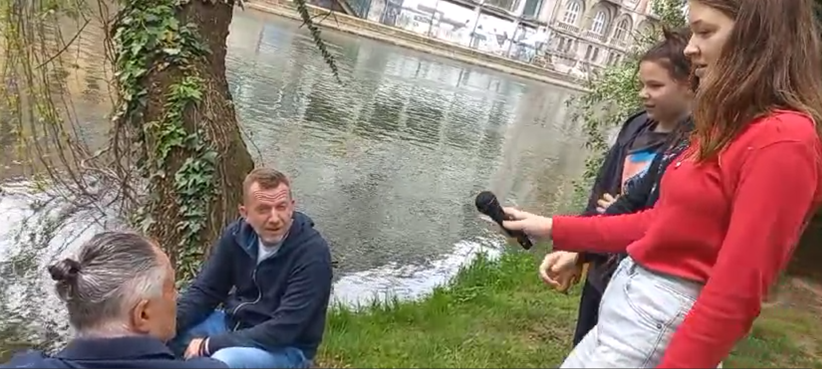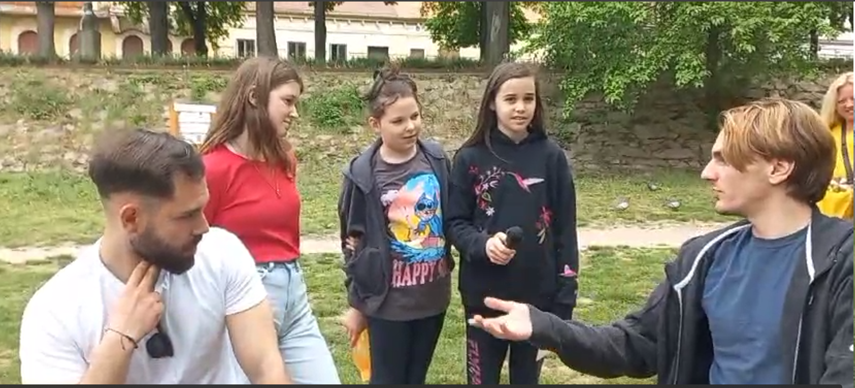 - Cu mult curaj, la microfon, elevii abordează pe stradă trecătorii, prezintă acestora atât școala, cât și titlul și obiectivele proiectului, apoi le adresează întrebările; elevii realizează astfel interviuri în limba română, dar și în limba engleză, atunci când persoanele intervievate sunt turiști străini (elevii fac parte dintr-o clasă de studiu intensiv a limbii engleze)
