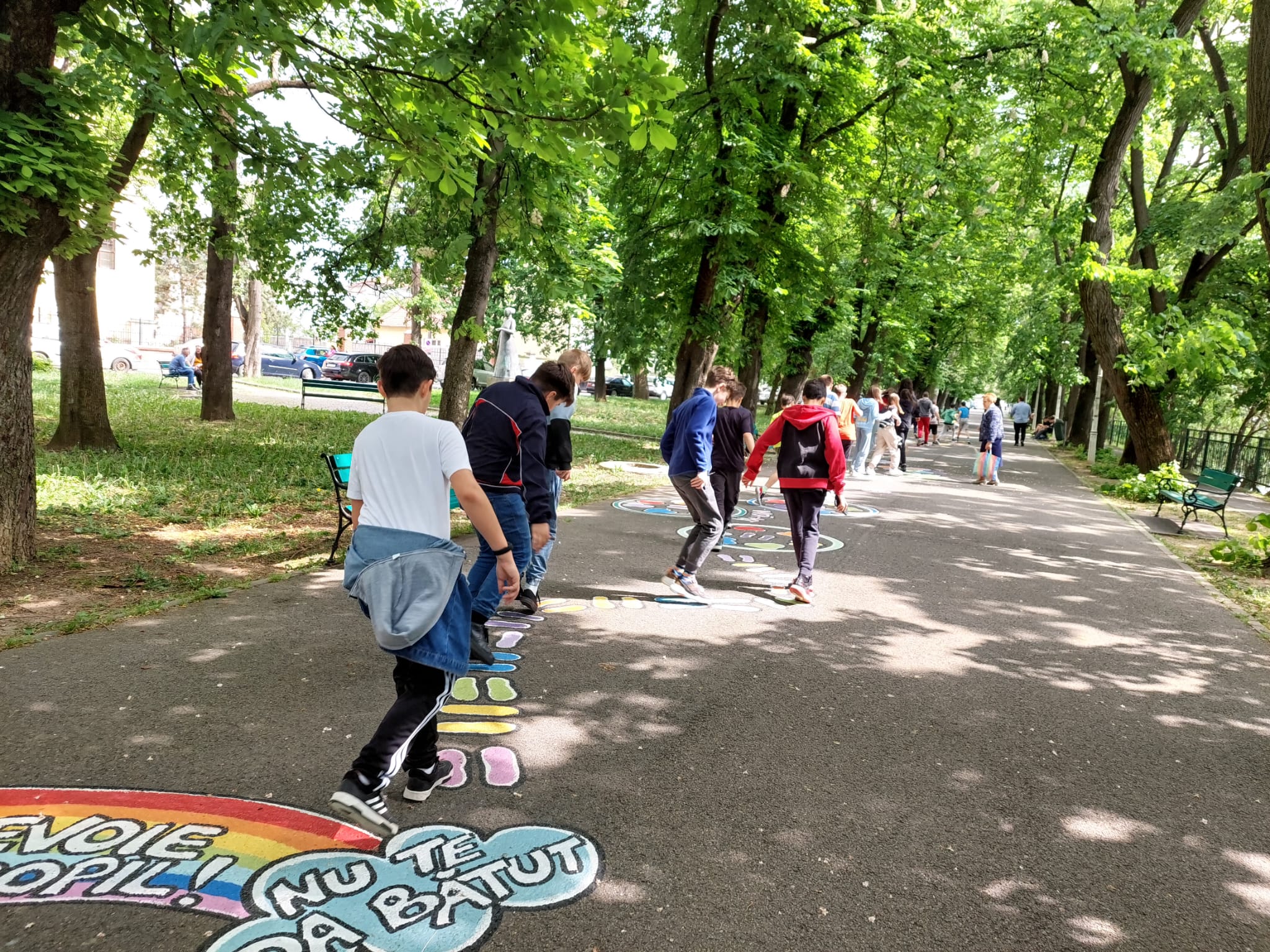 - Momentul interdisciplinar Fii adultul pe care ai vrea să-l ai lângă tine! a constat în exercițiul de mișcare ce a urmărit desenele de pe asfalt, inclusiv șotronul, pe care, de asemenea, elevii au putut descoperi valori morale și de caracter