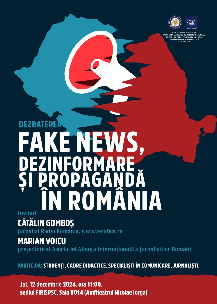 Pe data de 12 decembrie 2024, Universitatea din Oradea, prin Facultatea de Istorie, Relații Internaționale, Științe Politice și Științele Comunicării, organizează o dezbatere cu tema Fake News, Dezinformare și Propagandă în România.