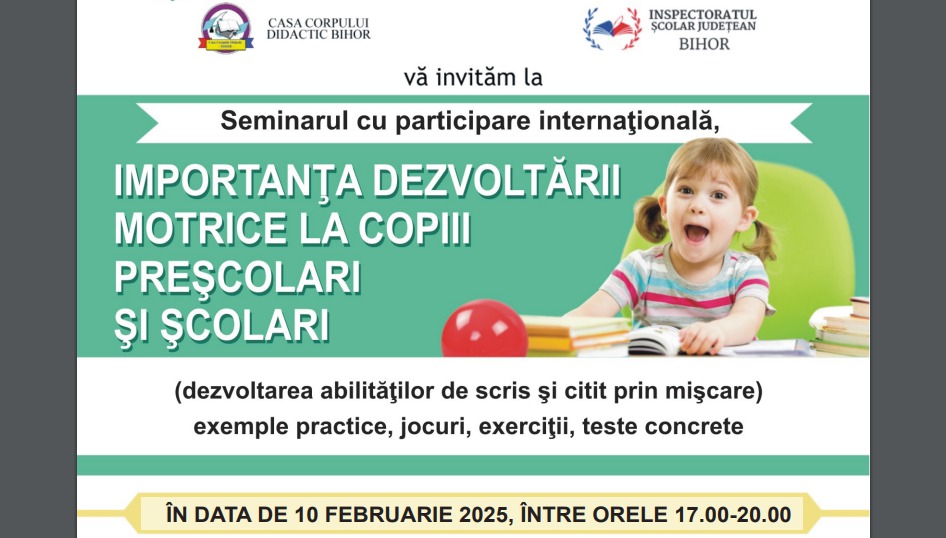 Acest seminar este menit să conștientizeze relația dintre abilitățile motrice și abilitățile de scris, citit la copiii preșcolari și școlari. Vor fi prezentate informații de specialitate privind dezvoltarea motrică a copilului, cât și exemple practice, jocuri, exerciții, teste concrete pentru a ajuta cadrele didactice să își îmbogățească paleta de cunoștințe.