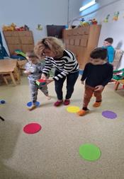 Un alt joc pe care l-am inventat pentru grupă și l-am introdus în rutina zilnică a fost Cercurile dansatoare – dansul și muzica combinate sunt modalități excelente prin care copiii cu TSA își pot dezvolta atât abilitățile motorii, cât și cele de comunicare; în plus, pot să-și exprime sentimentele și să se relaxeze.