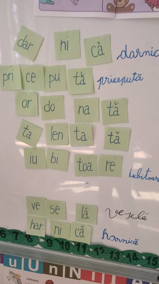 Trecerea la următorul moment s-a făcut pornind de la calitățile unei mame desprinse din legenda audiată. Fiind o oră de comunicare în limba română, elevii au citit în cor silabele amestecate ale celor 7 cuvinte. Pe rând au ieșit la tablă să le ordoneze corect, au găsit cuvântul pe care nu știu încă să-l scrie, iar pe celelalte le-au transcris pe rând, alți elevi. Au concluzionat și de această dată că toate cuvintele găsite și scrise sunt însușiirile unei mame. Elevii au ales din cele șapte pe cele care caracterizează propria lor mamă (cele care se potrivesc).