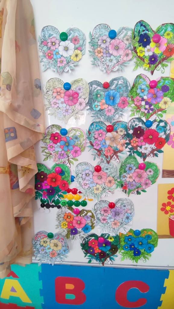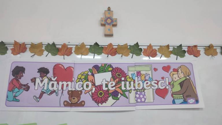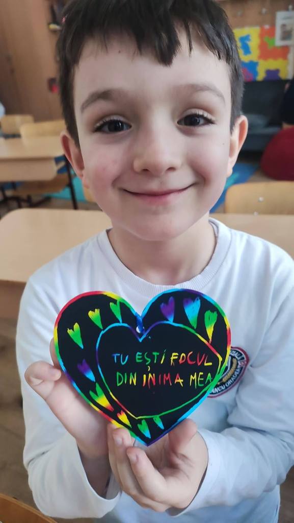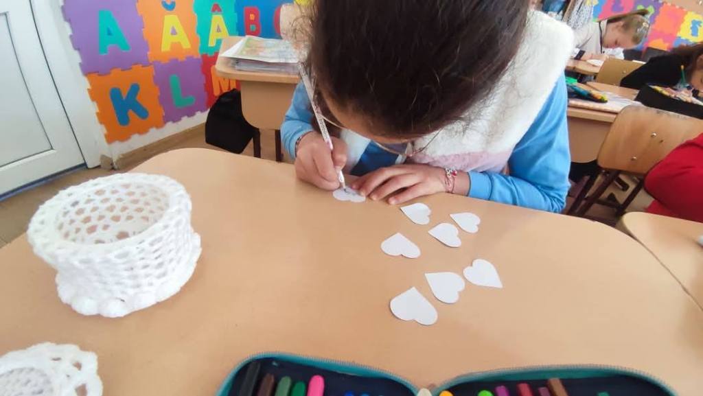 Elevii și-au exprimat urările adresate mămicilor, prin aruncareea și prinderea unei inimi de pluș de la un elev la altul.