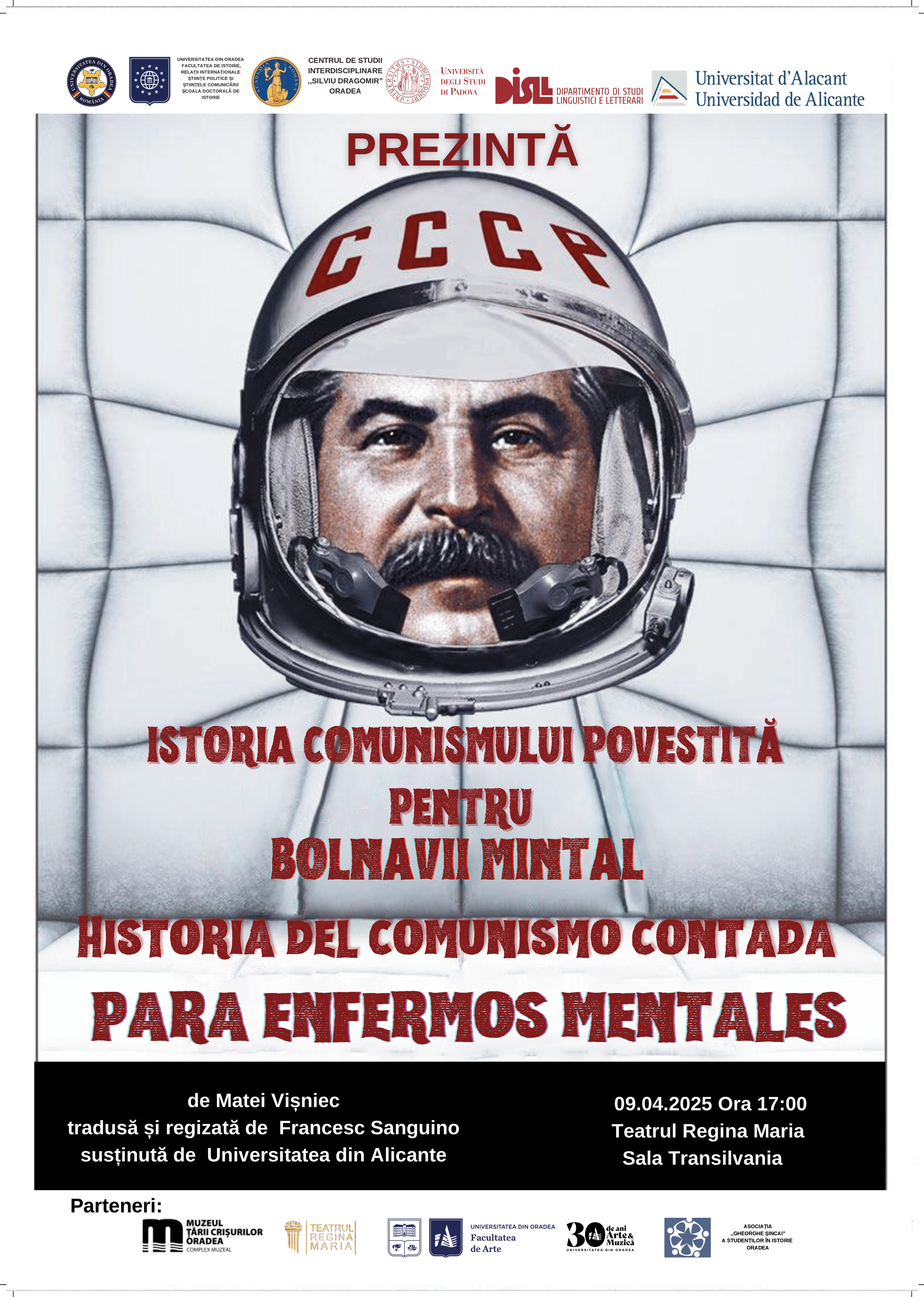 Sala Transilvania a Teatrului Regina Maria din Oradea va găzdui, în data de 9 aprilie 2025, de la ora 17:00, reprezentația piesei de teatru Istoria comunismului povestită pentru bolnavii mintal de Matei Vișniec, regia Francesc Sanguino, Universitatea din Alicante. Spectacolul se joacă în catalană, fiind subtitrat în limba română.