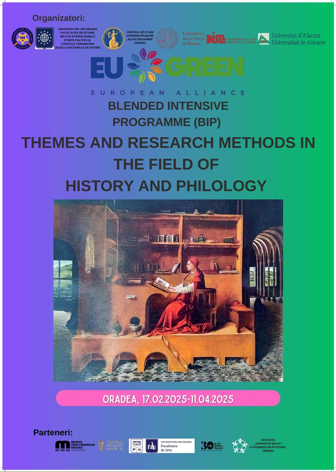 Universitatea din Oradea – Facultatea de Istorie, Relații Internaționale, Științe Politice și Științele Comunicării, Școala Doctorală de Istorie, Centrul de Studii Interdisciplinare Silviu Dragomir, în parteneriat cu Universitatea din Alicante (Spania) și Universitatea din Padova (Italia), derulează, între 17 februarie și 11 aprilie 2025, programul mixt intensiv Teme și metode de cercetare în istorie și filologie.